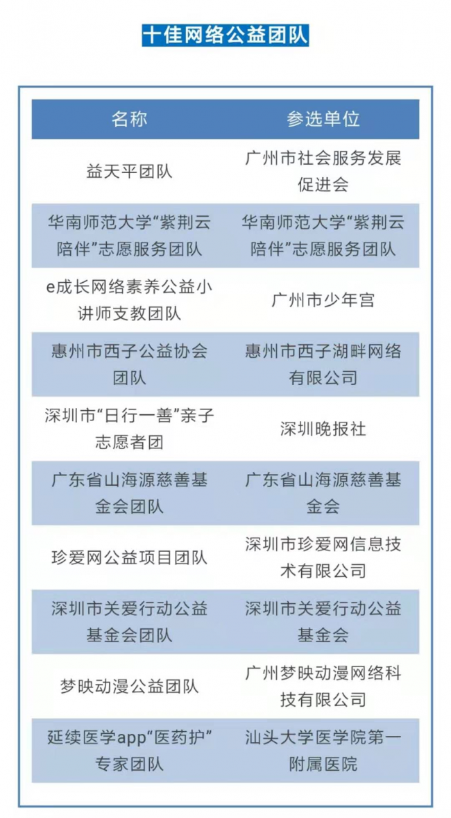 据悉,该活动自开展以来,共征集公益项目、团队及传播典型206组。经项目委员会专家初评,分别遴选了20组入围项目、入围团队和入围传播典型进行网络展示与投票;经过为期7天在线投票,结合网络投票结果,项目评委会专家再次对入围项目、团队及传播典型进行终评复议,最终评选出十佳网络公益团队、网络公益项目和公益传播典型。梦映动漫凭借网络公益方面的长期努力,入围“广东十佳网络公益团队”,同时入围广东十佳网络公益的还有网易、腾讯、酷狗、欢聚集团、广东省文化馆、深圳市关爱行动基金会等。